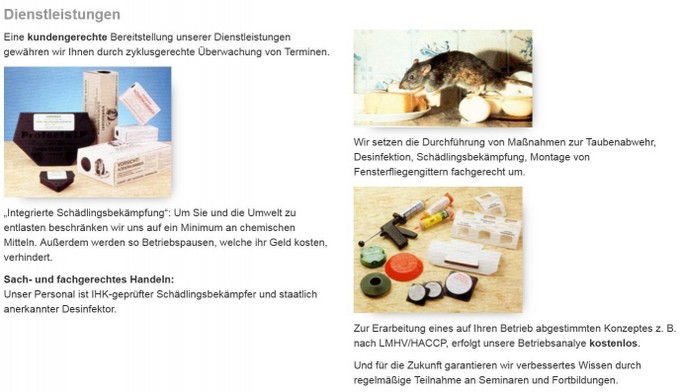Das Unternehmen wird in der Weissen Liste der Schädlingsbekämpfer im Internet geführt, engagiert sich im Verbraucherschutz vor "schwarzen Schafen" aus der Branche und erhielt das Zertifikat "Geprüfte Ortsansässigkeit"...